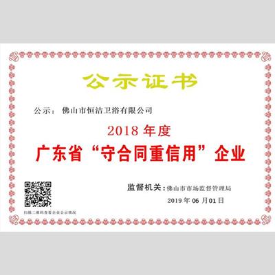 奖 项:"2018年度广东省“重合同守信用”企业 ——佛山市好色先生APP下载卫浴有限公司"